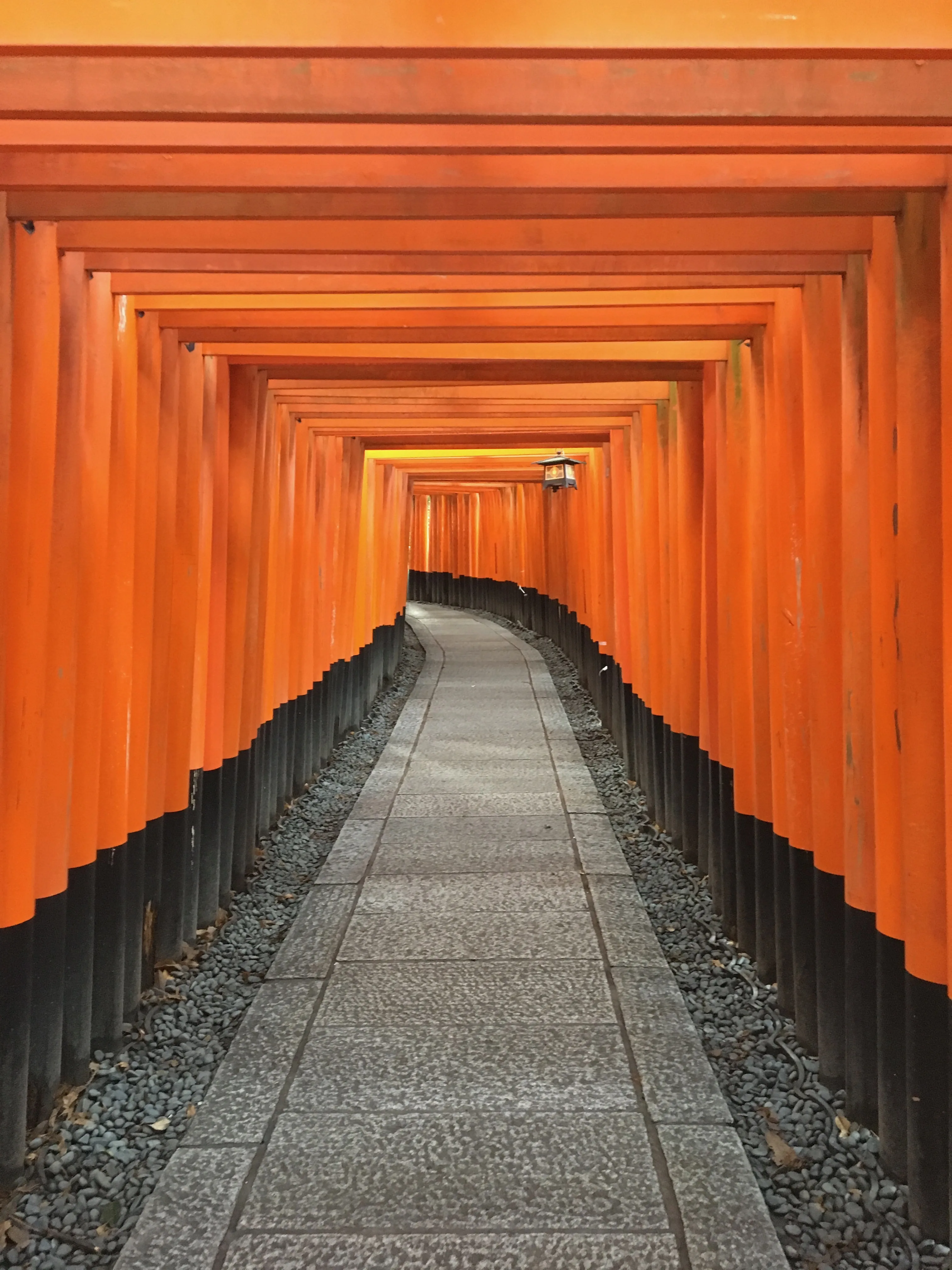 大概七点刚出头就到了神社。虽然距离标注的正式参观时间还有半个小时,但其实已经允许游客上山了。于是乎一个人独享了千本鸟居——如照片中那般漂亮,尤其是阳光斑驳地穿过朱红色鸟居的缝隙时,心境澄明。千本鸟居朝上就很少有游客会去了,石阶两旁立着石碑和神龛,供奉神祇。途中有两处可以请护符的平台,我看到一个木质的白狐守,很喜欢它的造像,就带了一个放在背包里。后来在安娜堡时,有一次差点被车撞到,回到家发现那个白狐守从中间整整齐齐断成两截,有那么一丝恍惚感。