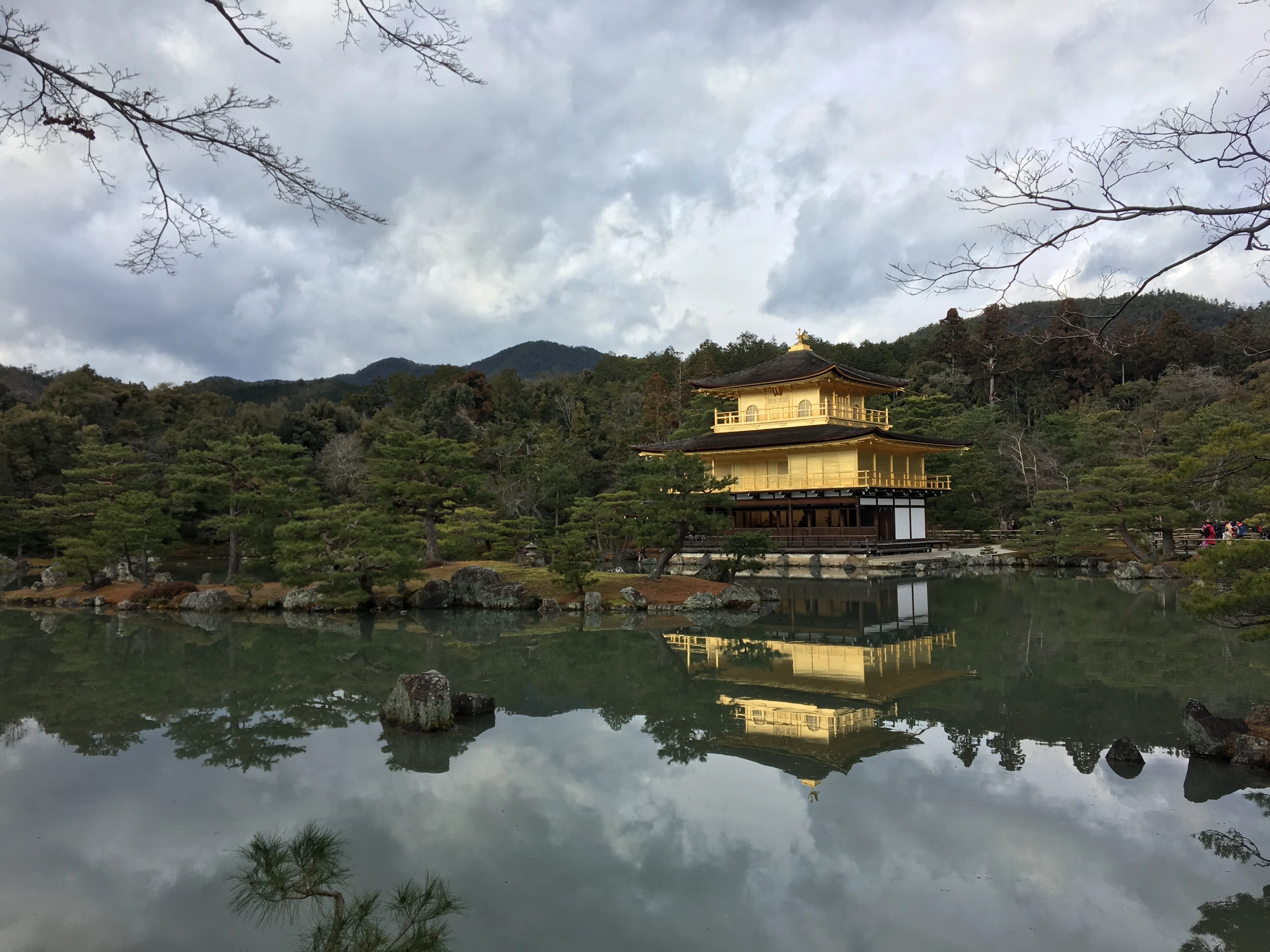 一路天空开始下起了小雨,云层舒卷,给京都添了些厚重感。在鸭川河畔下了车,雨也渐渐停了,于是乎沿着鸭川散步。鸭川的水很清,也很浅,能听到汩汩的水声。沿河散步的多是伴侣,有年轻人也有老人,牵着手,说着悄悄话。水中有云的倒影,我很享受这般宁静平和的氛围。之后又走了走河畔的小巷弄,积水的石板路映着红灯笼,朦朦胧胧中又转去了花间小道。我曾听说会有艺伎穿行于祇园和花间小道,可惜并未得见,小道上的酒家店面都挂着门帘,望进去是道道屏风,有着身穿和服的女子和举杯的客人。我徘徊了许久,想象着樱花盛开,粉白与红。
